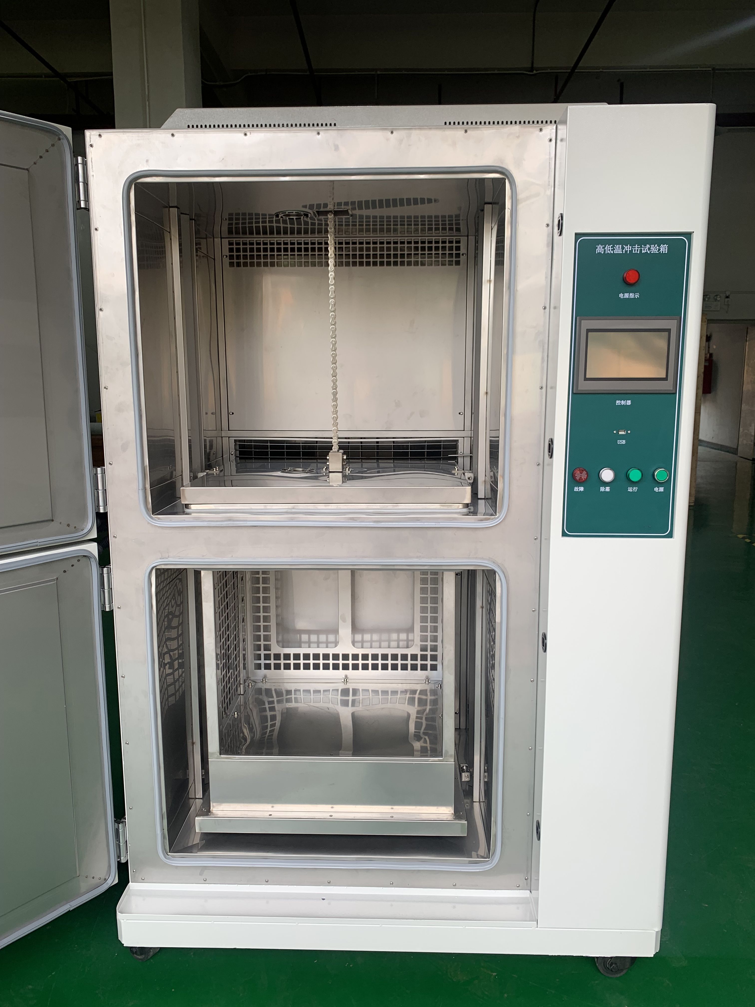 主流為雙腔體結構(高溫腔、低溫腔 + 中間過渡區),雙腔體設計中,樣品通過機械臂或吊籃在高低溫腔之間快速轉移(轉移時間≤10 秒),避免中間溫度緩沖;